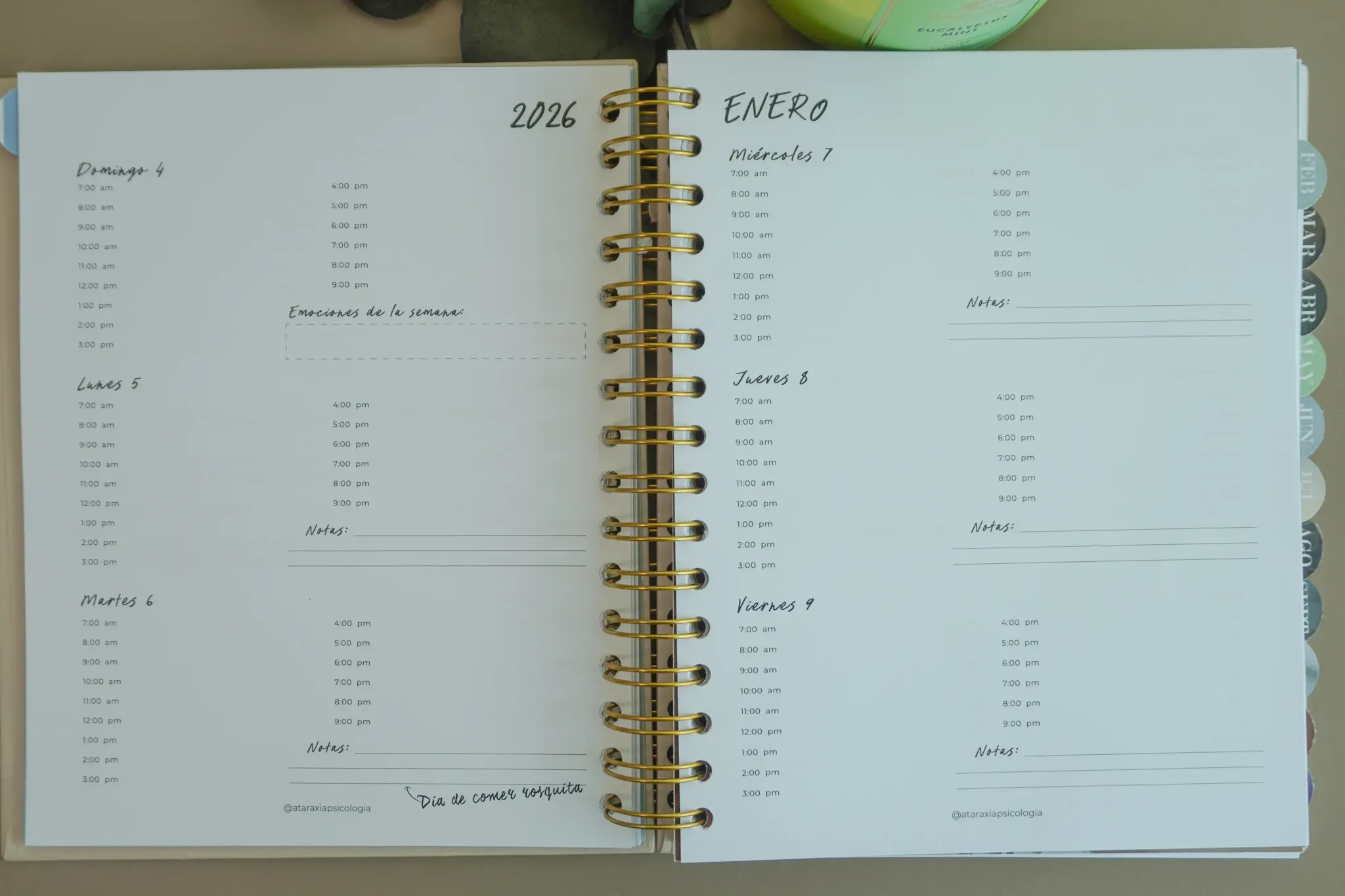 Está agenda esta diseñada no solo para ayudar a organizarte, sino para que te encuentres a ti misma/o y te lleves a un crecimiento personal. Durante sus 12 meses encontrarás actividades psicoterapéuticas para reflexionar y trabajar en ti misma/o.
